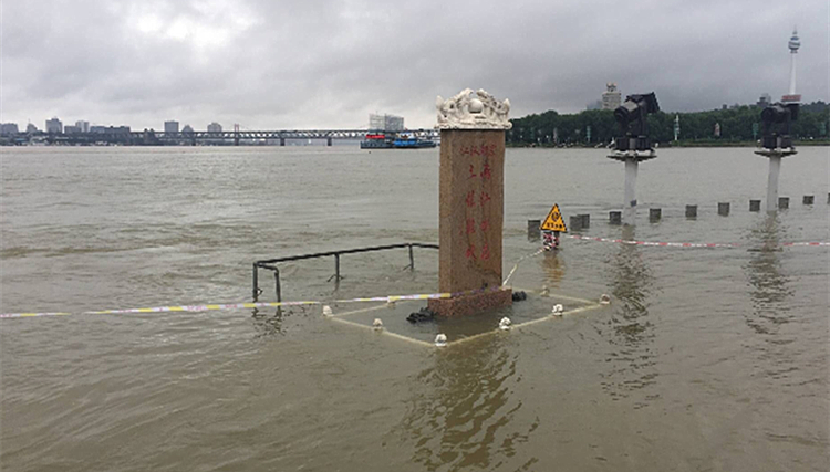 6日下午4点,长江武汉关水位突破28米,龙王庙石碑的基座没入水中。
