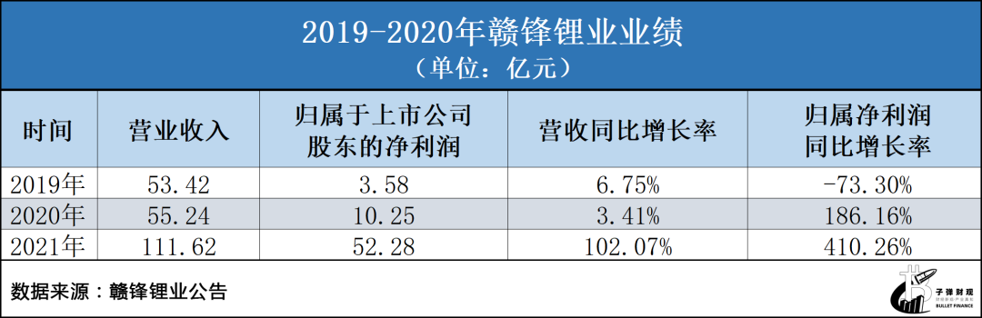 2021年,赣锋锂业实现营收111.62亿元,同比增长102.07%;实现归属于上市公司股东的净利润52.28亿元,同比增长410.26%。