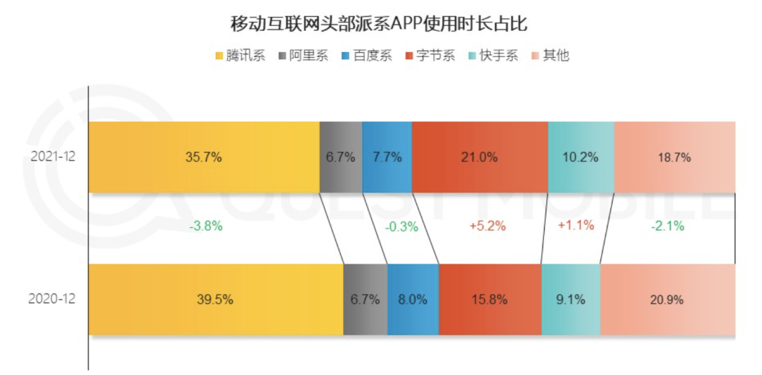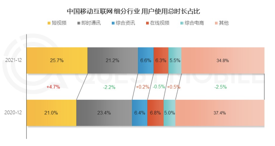 根据QuestMobile的数据,2021年12月,用户在短视频平台上的使用时长占比同比上升4.7个百分点,远远高于综合电商提升的0.5个百分点。