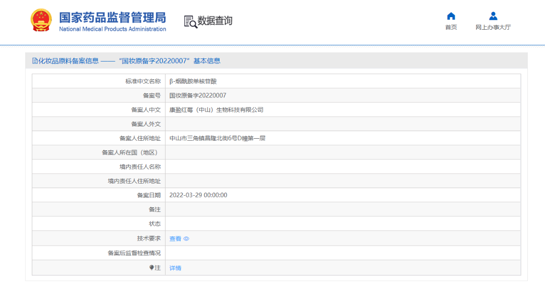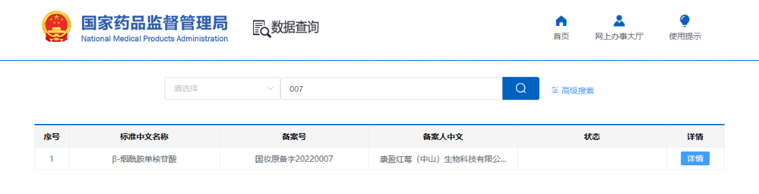值得关注的是,早在2022年1月24日,备案人余姚莱孚斯本健康科技有限公司,申请了β-烟酰胺单核苷酸的备案,备案号为国妆原备字20220002,目前处于监测期。