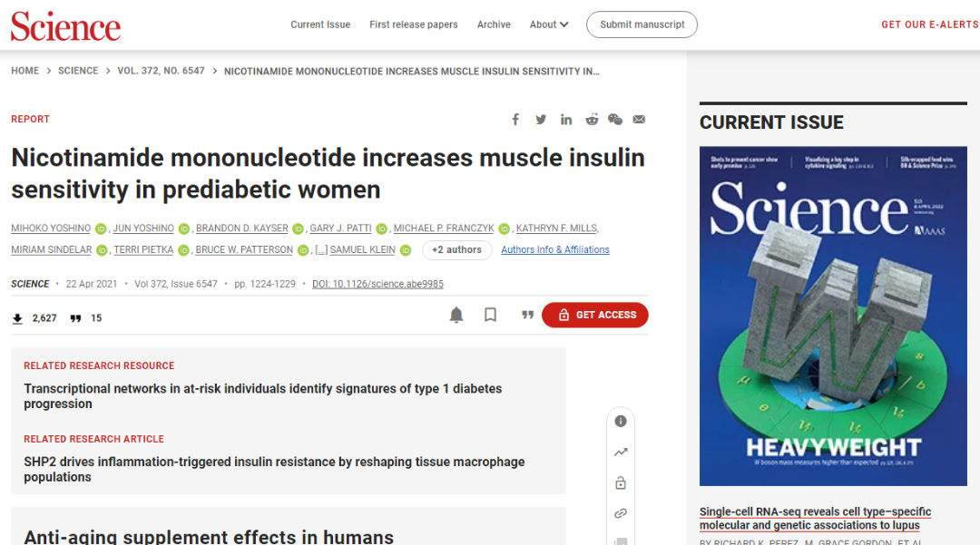且据近期华盛顿大学的研究人员首次进行了NMN对人代谢影响的随机临床试验。C2CC传媒在《Science》上,查看了其研究成果,据“Nicotinamide mononucleotide increases muscle insulin sensitivity in prediabetic women”的内容显示:NMN增加糖尿病前期女性的肌肉胰岛素敏感性,可提高胰岛素增加骨骼肌葡萄糖摄取的能力,改善与肌肉结构和重塑有关的基因的表达。