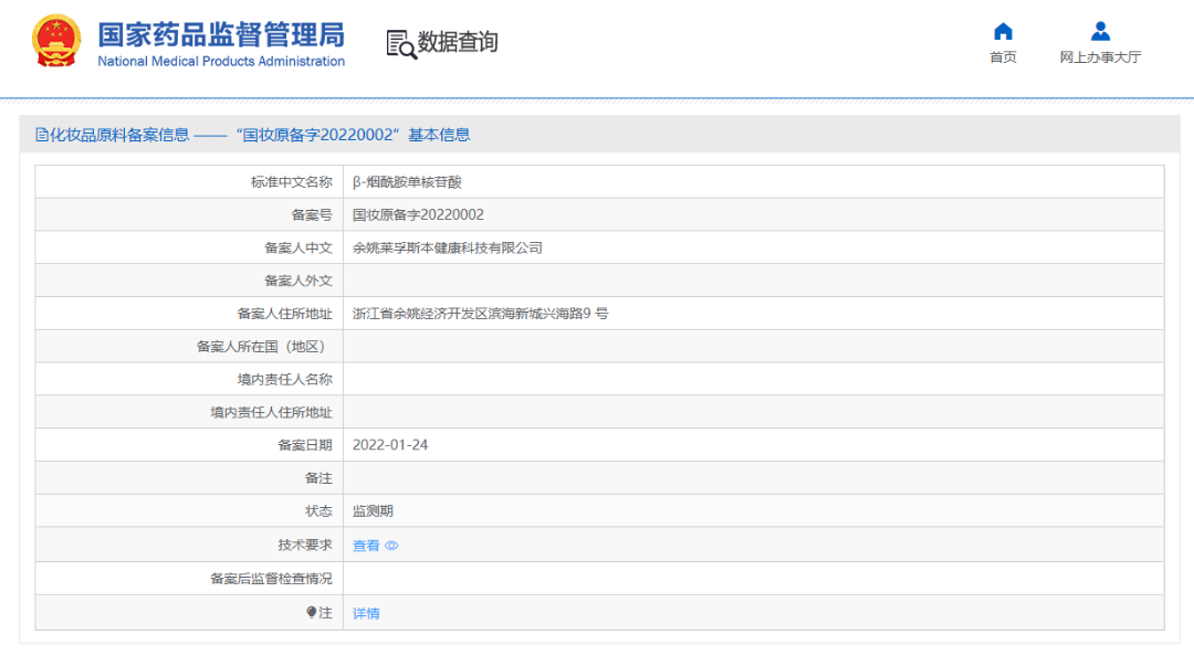 从备案人余姚莱孚斯本健康科技有限公司所备案的信息来看,目前其申请的β-烟酰胺单核苷酸(国妆原备字20220002)的状态属于监测期。