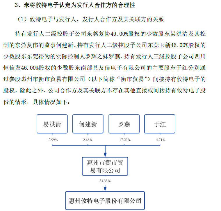 复协电子少数股东易洪清及其控制的复伟电子监事何建新通过惠州市衡市贸易有限公司(下称“衡市贸易”)参股攸特电子。衡市贸易持有攸特电子1425.17万股,占其总股本的比例为32.12%,为其第二大股东。易洪清及何建新分别持有衡市贸易2.99%、2.68%股权。