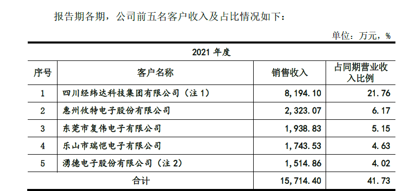 比如,东莞市复伟电子有限公司(下称“复伟电子”)成立于2016年11月,成立当月即开始与科瑞思开展业务合作,2020年和2021年,科瑞思对复伟电子的销售金额分别为1,176.1万、1,938.83万,占其当年收入比例分别为4.71%、5.15%,分别为当期第四大、第三大客户。
