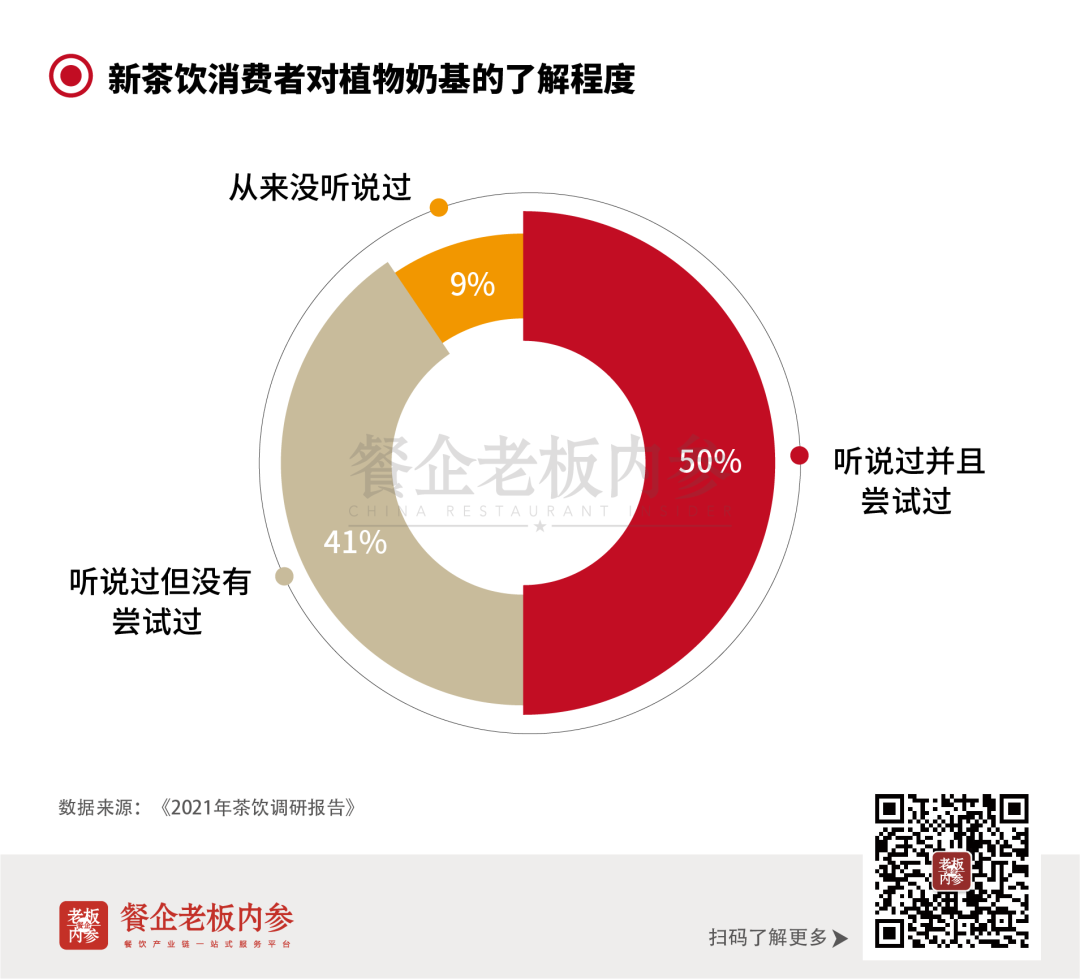 新茶饮消费者的这群年轻人很了解这些。《2021年茶饮调研报告》显示:新茶饮消费者对奶基有一定的认知,并有较高意愿尝试植物奶基产品。有91%的消费者知道植物奶基,并且有50%的消费者不仅知道且购买尝试过。尝试过的消费者中,95%的人愿意复购。