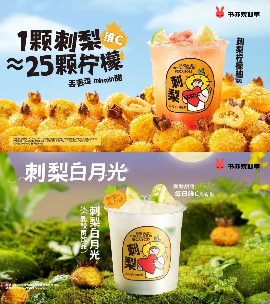 从水果选择来看,7款产品中,3款都和刺梨有关。刺梨富含多种营养素,维C含量出奇地高。经检测,100g刺梨当中维C含量为1900ml,而100g柠檬当中的维C含量则为22mg(中国食物成分表 标准版第6版),也就是说,一颗30g的刺梨维C含量约等于25颗100g柠檬。这几款新品,着实清爽。