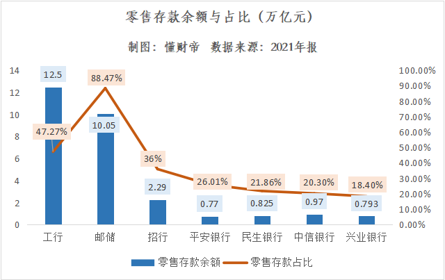 2021年,受益于庞大的零售客户规模,工行、邮储两家国有大行的零售存款余额均超过了10万亿大关,分别为12.5万亿元、10.05万亿元。