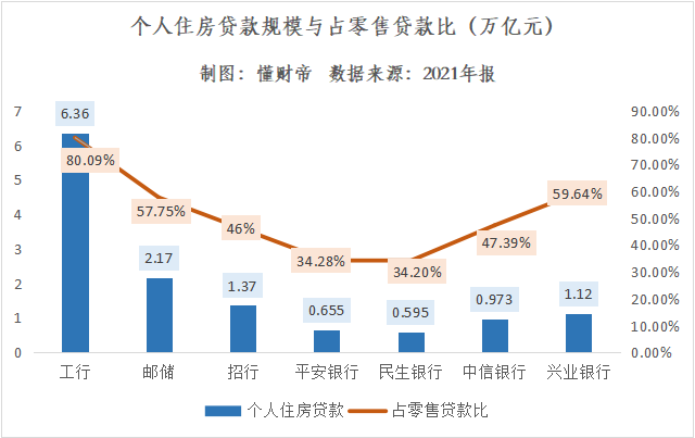 截至2021年末,工行个人住房贷款规模高达6.36万亿元,几乎是后六家银行的总和,占零售贷款比也高达80.09%。