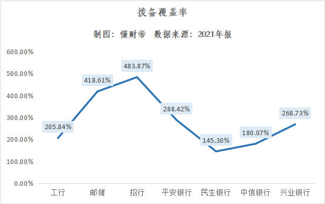 最后再来看一下拨备覆盖率。2021年,民生银行、中信银行、工行的拨备覆盖率相对较低,分别为145.3%、180.07%、205.84%。