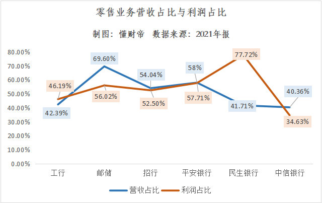 2021年,邮储、招行、平安银行的零售业务营收占比分别为69.6%、54.04%、58%,零售利润占比分别为56.02%、52.5%、57.71%。这意味着零售金融已成为三家银行业绩增长的核心动力引擎。