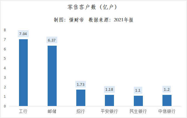 截至2021年末,工行、邮储零售客户数分别为7.04亿户、6.37亿户。