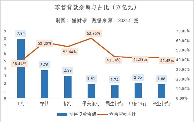 零售贷款余额方面,工行与邮储银行形成了断崖式差距。截至2021年末,工行零售贷款余额为7.94万亿元,邮储银行为3.76万亿元,还不到工行的一半。