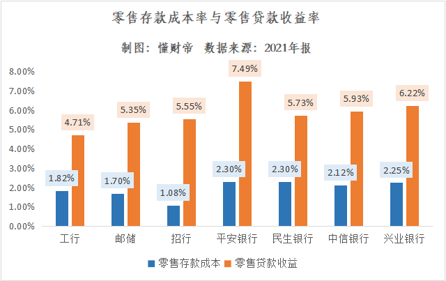 2021年,招行零售存款成本率在七家银行中最低,仅为1.08%,彰显了其在零售负债端的强大优势。
