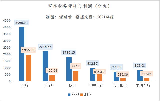 邮储银行零售业务的赚钱能力相对较弱,零售利润仅为456.04亿元。