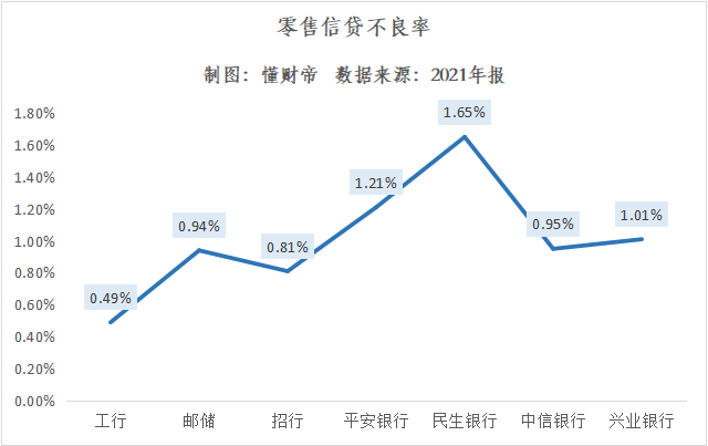 中信银行、兴业银行零售信贷质量持续向好,不良率分别为0.95%、1.01%,较2020年分别下降了0.15、0.03个百分点、
