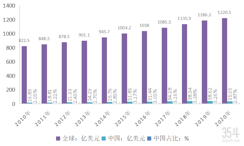 图:2010-2020年全球巧克力市场规模及中国市场份额统计,数据来源:智研咨询