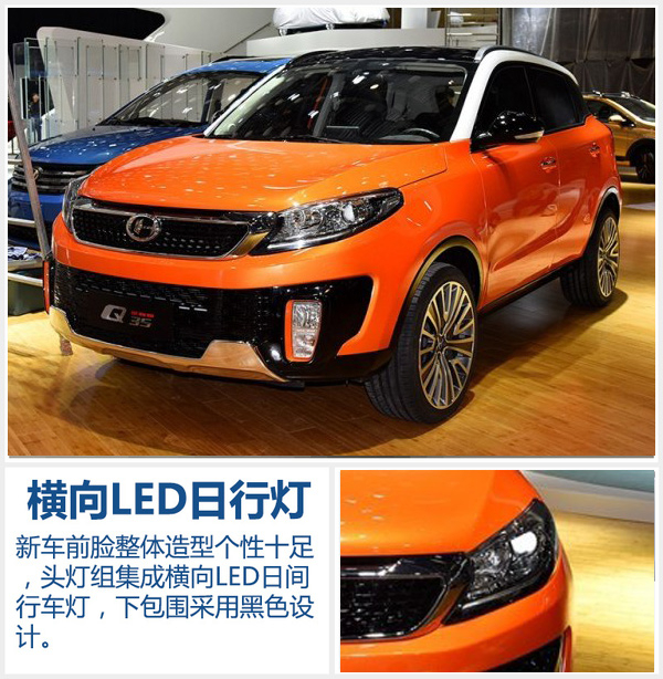 昌河Q35整体设计风格趋向城市SUV的时尚化风格,诸多细节元素设计的十分个性,与大家印象中的昌河产品截然不同。新车前脸配备弧形线条勾勒的头灯组,并向两侧车身延伸,内部集成了横向LED灯组,点亮后视觉效果不错。下包围采用大面积的黑色饰板装饰,搭配竖向雾灯设计,看上去十分个性。