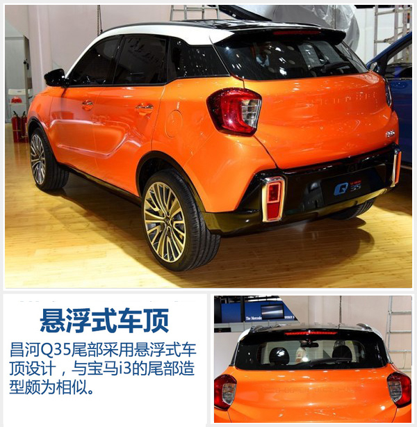 昌河Q35侧身配备双五辐造型的轮圈,延续整车时尚个性化设计风格。新车顶部配备行李架,并采用悬浮式造型,在尾部形成迷你“鸭翼”造型,这一设计与宝马i3尾部造型颇为相似。车尾整体设计较为简洁,昌河品牌拼音字母镶嵌其上,搭配两侧类似圆形的尾灯设计,下侧灯组则采用竖向设计与车头相呼应。
