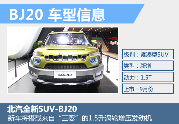 BJ20搭载一台1.5T涡轮增压发动机,这台发动机最大功率有望达110千瓦,峰值扭矩为190牛米。这款车搭载的是一台来自航天三菱的1.5升涡轮增压发动机,这款发动机是三菱4A91发动机的改进型号,通过加入涡轮增压这一项技术,4A91增加了25%的功率输出以及40%的扭矩输出。