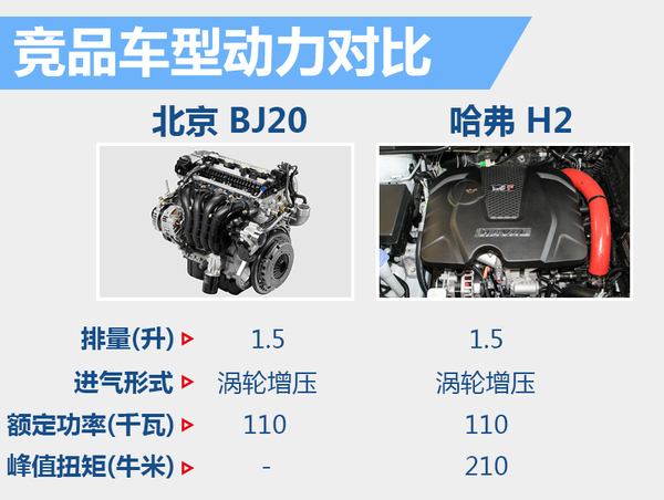 动力方面,同级别车型哈弗H2所搭载的1.5升涡轮增压发动机,最大功率为110千瓦。未来全新BJ20搭载的1.5升涡轮增压发动,最大输出功率同样为110千瓦,动力上与竞品车型相同。