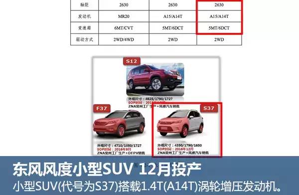 根据江苏省环保厅公布的消息,东风风度全新小型SUV代号为S37,外观尺寸为4350*1790*1650毫米,SOP(量产)时间为2016年12月,将由风雅汽车销售。动力方面,东风风度小型SUV搭载1.4T涡轮增压发动机喝一款1.5升自然吸气发动机,传动系统匹配5速手动变速器和6速双离合变速器。
