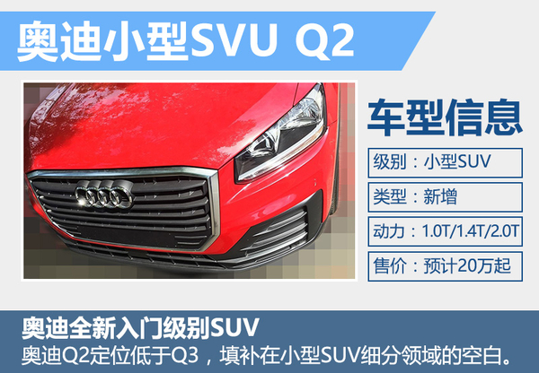 目前在奥迪品牌的SUV产品线中,Q3定位于紧凑级SUV,随着奥迪Q2的推出,不但填补了小型SUV的空白,同时帮助奥迪品牌在SUV领域入门价格进一步下探。根据奥迪的定价体系,未来全新Q2售价有望下探至10万元区间。动力方面,车辆将搭载1.0TFSI、1.4TFSI与2.0TFSI三款涡轮增压发动机。