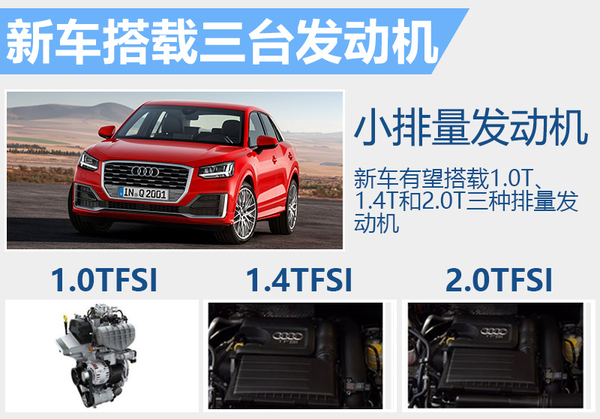 动力部分,新车有望搭载1.0T、1.4T和2.0T三种不同排量的三缸、四缸涡轮增压发动机供消费者选择,其中1.0升涡轮增压发动机可输出85千瓦的最大功率,峰值扭矩达200牛米。驱动方式,新车将采用前轮驱动的形式,同时也可选配四轮全驱。除了传统动力车型外,奥迪Q2未来还将衍生出一款采用新能源技术的插电混动版车型。