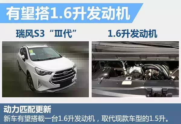 目前在售的瑞风S3全系搭载1.5升自然吸气发动机,最大功率83千瓦,峰值扭矩146牛米,匹配了手动和CVT变速箱。新款产品的动力配置尚未公布,但有消息称新车将更换1.6升自然吸气发动机,目前该发动机已匹配在瑞风M3车型上,动力参数相比1.5升有所提升,最大功率和峰值扭矩分别达到88千瓦和150牛米。