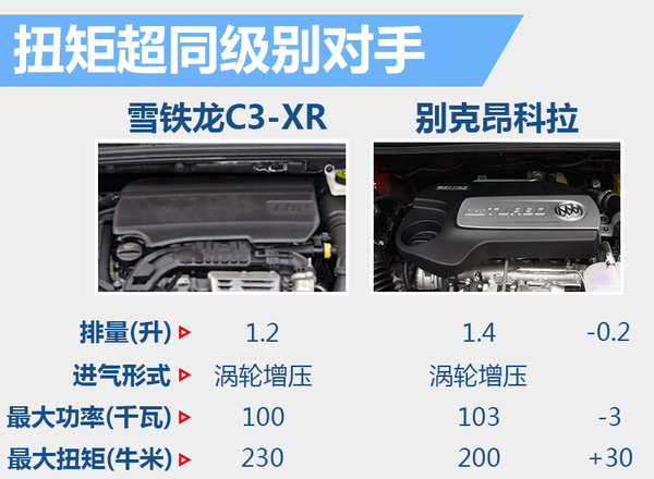 在同级别车型中,别克昂克拉搭载一台1.4升直列四缸涡轮增压发动机,最大功率103千瓦,最大扭矩200牛米。而新车搭载的1.2THP发动机在最大功率100千瓦,最大扭矩达到230牛米,虽然新车在功率上较昂科拉降低了3千瓦,但在扭矩上实现了超越,同时更小的排量也使燃油经济性方面得到保障。
