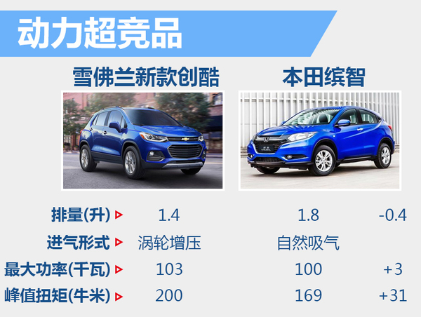 以2015年合资品牌小型SUV的销量冠军本田缤智为例,缤智搭载1.8升自然吸气发动机,最大功率100千瓦,峰值扭矩169牛米。新款创酷将沿用现款搭载的1.4T涡轮增压发动机,最大功率103千瓦,峰值扭矩200牛米。两车动力对比后发现,新款创酷占据一定的优势。