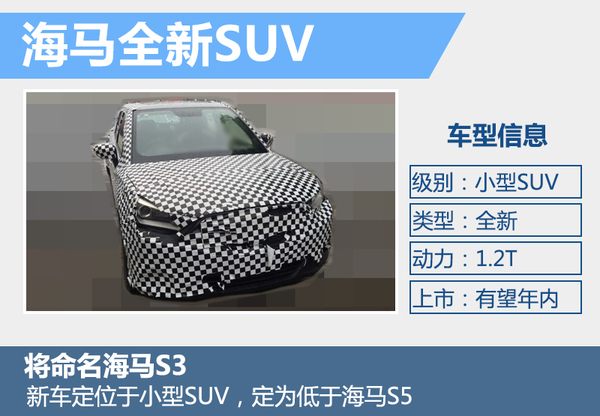 海马S3是海马首款小型SUV,定位低于海马S5,有望于年内上市。其外观造型与海马S5有些相似,不同的是大灯组造型采用全新设计,并有望配备LED日间行车灯。新车的尾灯造型设计与海马S5基本相同,但尾部线条则更加富有层次感。此外,根据海马规划,包括1.2T在内的全新增压发动机有望配装在旗下小型车,S3有望成为第一款搭载1.2T增压发动机的车型。(图/文 网通社 王星驰)