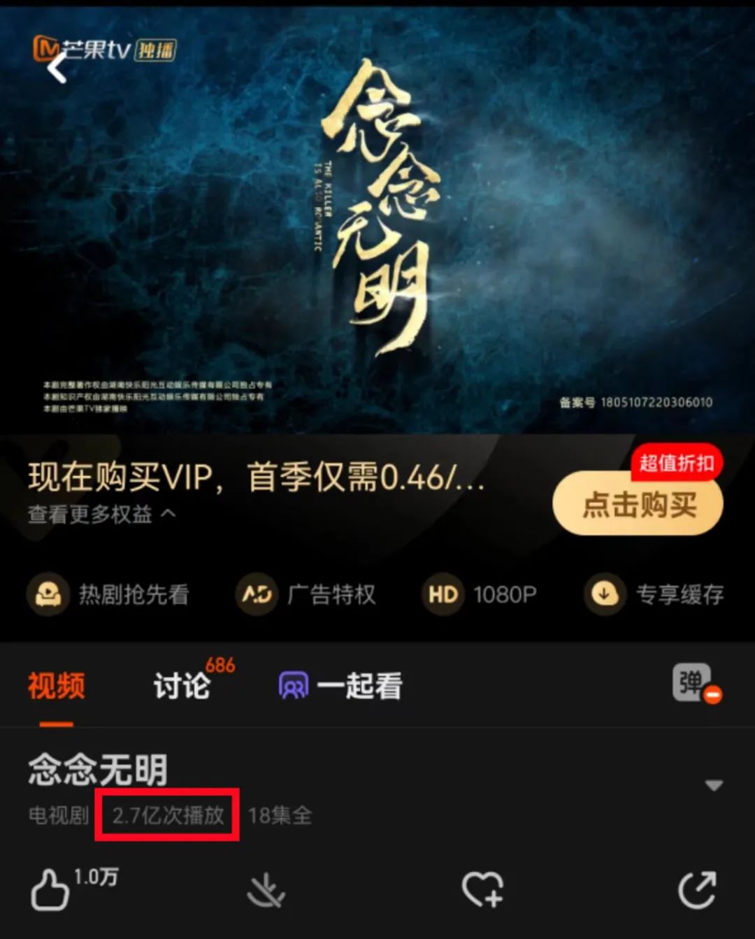 这部在芒果TV播出的短剧《念念无明》,日前收官拿下了2.7亿播放量,一个放在抖音、快手也相当不错的成绩。同时,该剧首日登上平台搜索第一,从上线以来持续占据芒果TV热度总榜前三,整体数据仅次于在播头部剧《玉面桃花总相逢》。