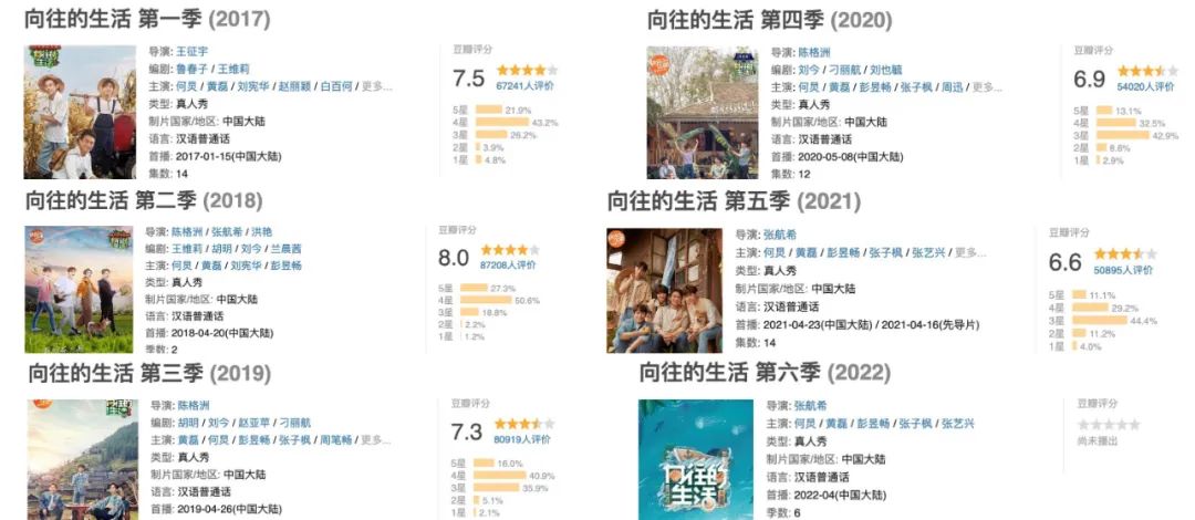一个鲜明的指标,《向往》自第二季攀上8.0豆瓣评分巅峰后,第三季7.3,第四季6.9,第五季6.6,妥妥地划出了一道口碑逐季下跌的抛物线。坐稳国民综艺名号是不假,一边拍一边被骂也是事实。
