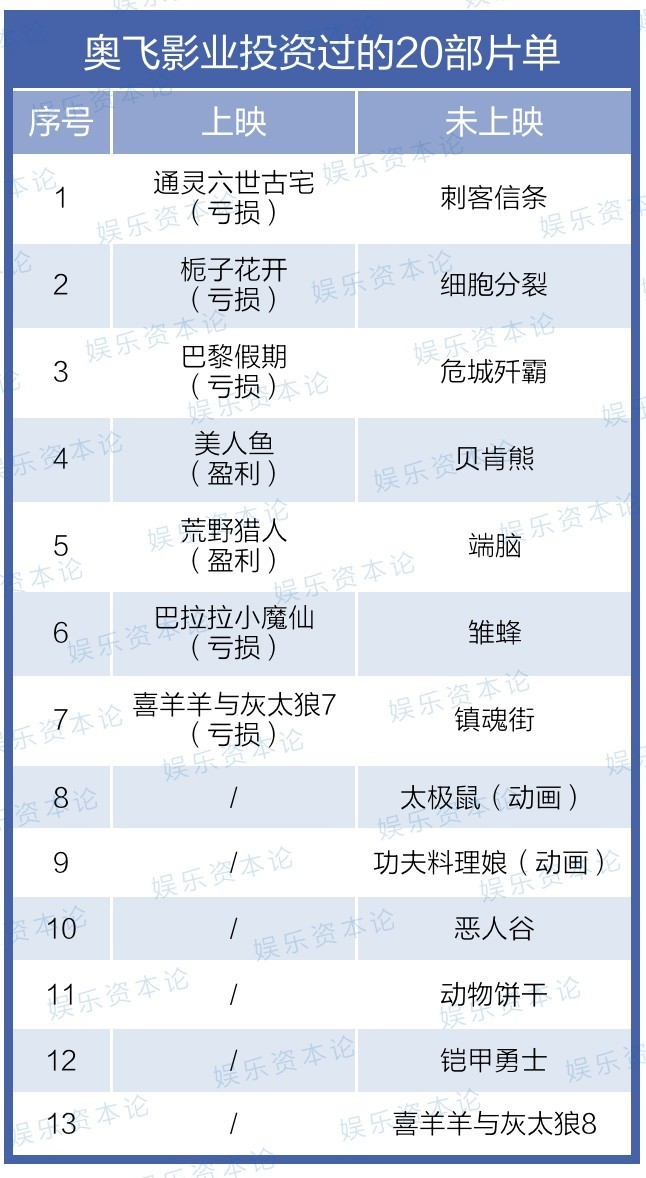 在娱乐领域的项目和公司投资中,有些业绩比较漂亮,但也有些产生了一定亏损。目前奥飞上映的多部电影中,除了《美人鱼》和《荒野猎人》之外,其余包括《喜洋洋》《栀子花开》《通灵六世之古宅》等6部电影都没有赚到钱(《栀子花开》《通灵》是通过奥飞投资的剧角映画参与保底)。