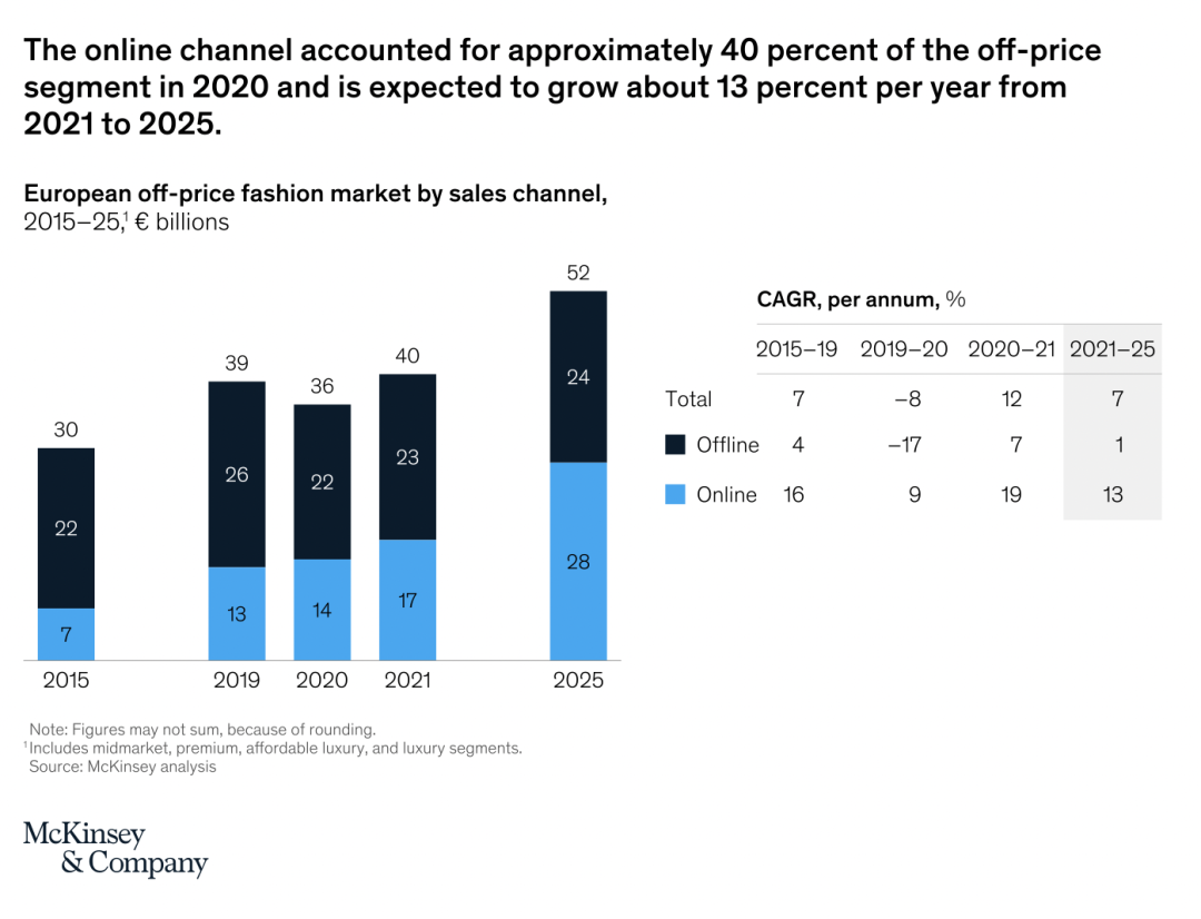 在线渠道的发展是推动折扣市场的关键因素。目前,在线销售占据了约40%的折扣零售市场份额,远高于整个时尚市场的份额。从2021年到2025年,欧洲的在线折扣零售市场预计每年增长13%至16%。