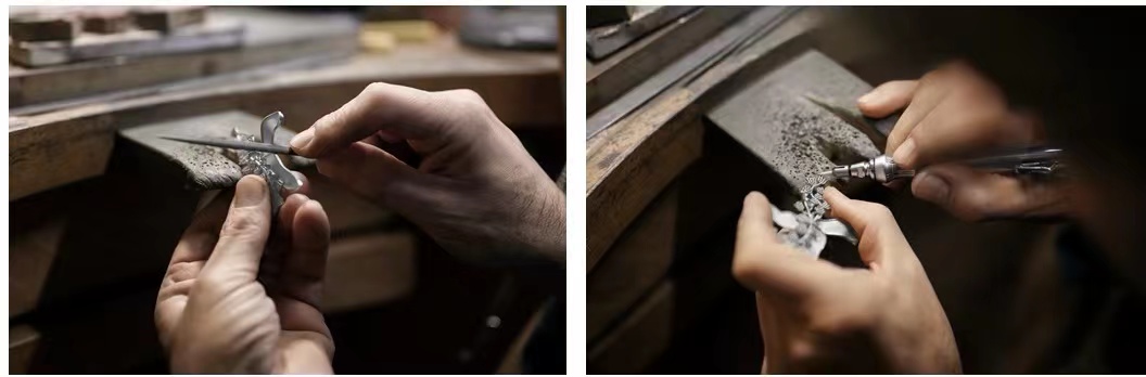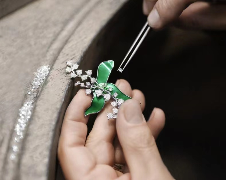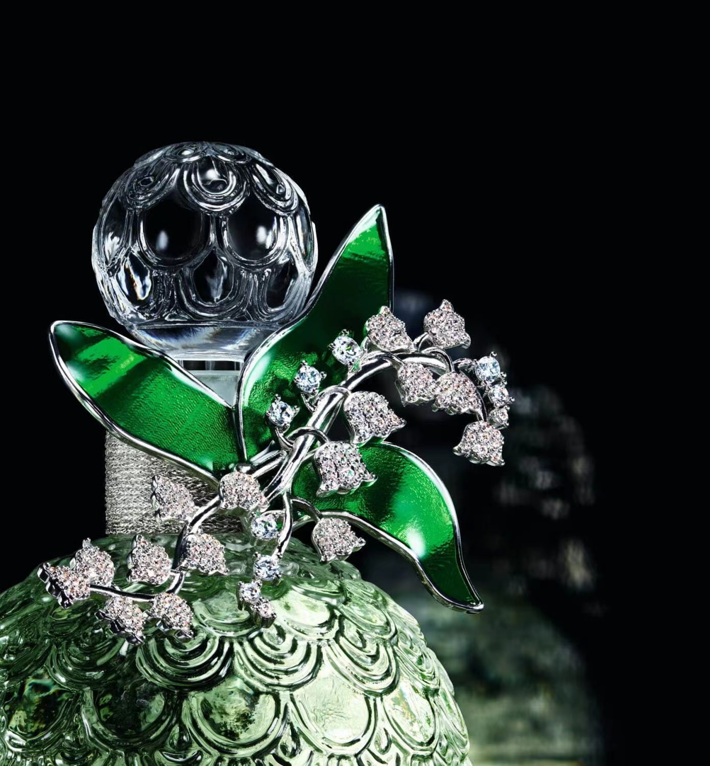 Muguet淡香水瓶身依旧采用蜜蜂拓印,最为夺目的部分是装饰在瓶口的铃兰花枝珠宝装饰,它由巴黎特鲁塞利珠宝工坊的艺术家Atelier Truscelli亲自操刀创作,雕刻了一支如钻石般闪耀的幸运之花铃兰,运用130多颗水晶锆石手工镶嵌组成了精致的花朵,鲜绿两次冷珐琅勾勒出枝叶,营造出丰满的立体感,最后以银线将珠宝铃兰花固定于蜂姿瓶之上。铃兰花枝低语呢喃,娓娓道来春日幸福时光。
