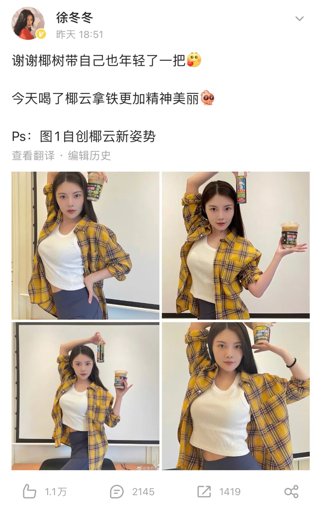 而椰云火爆之后,小红书上很快出现“椰云正确喝法”挑战热潮,网友争先恐后模仿椰树代言人徐冬冬在椰树椰汁包装上的广告造型,徐冬冬甚至亲自上阵示范“正确喝法”。