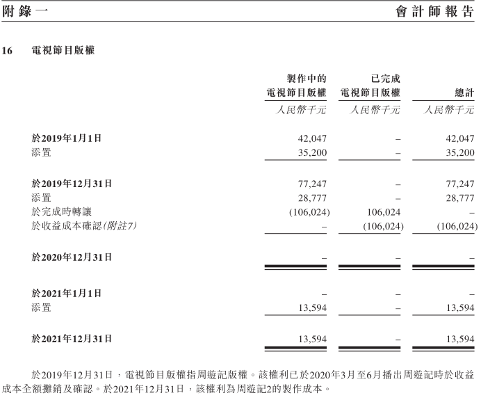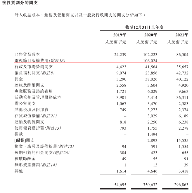 然而打造和运营IP的投入却是巨大的。招股书显示,2020年公司开支占比最大的为电视节目的版权费用,即《周游记》的版权费用,共计1.06亿元,占公司当年总收入的23.2%。