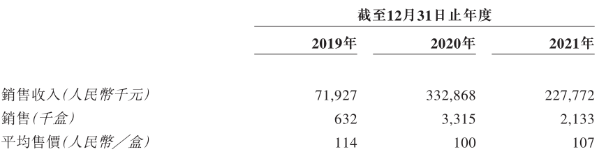 截至2021年截至12月31日,魔胴咖啡的销量分别从2020年同期的331.5万盒,跌至213.3万盒。尽管在2021年,魔胴咖啡每盒的售价较2020年上涨了7元,销售收入仍然从2020年的3.33亿元大幅下滑至2.28亿元,占总收入比例从72.8%跌至62.3%。