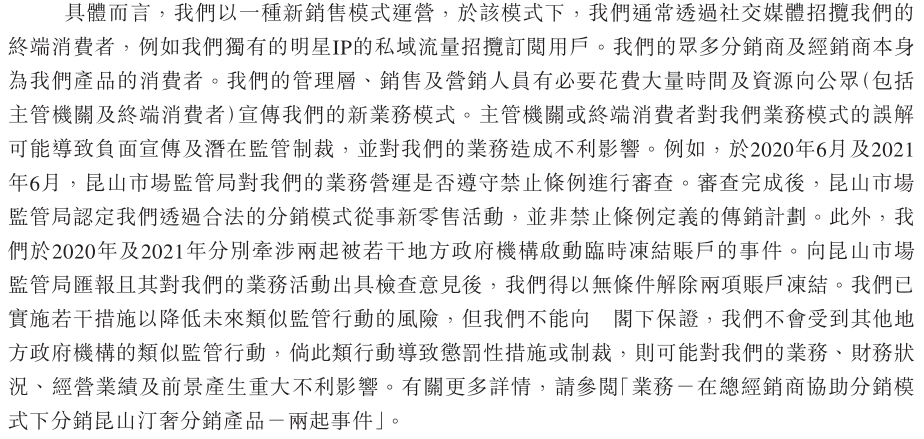 对此,巨星传奇表示公司以「一种新销售模式运营」,并通过社交媒体招揽终端消费者,而众多分销商及经销商本身也是产品的消费者。巨星传奇也承认,主管机关或终端消费者对公司业务模式的误解可能导致负面宣传及潜在监管制裁,并对业务造成不利影响。