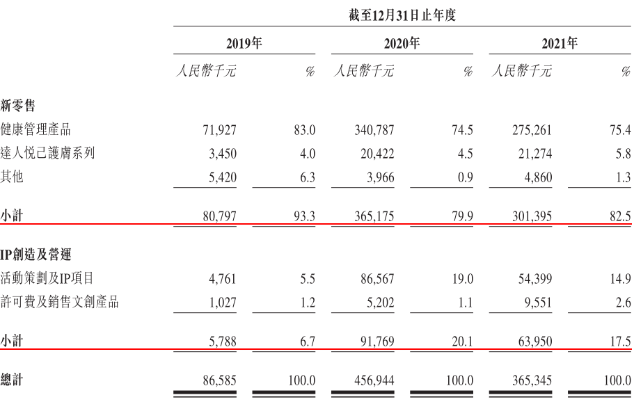所谓的新零售业务,包含健康管理产品、达人悦己护肤系列以及其他三部分。这里面贡献营收最大的要数健康管理产品,近三年贡献营收均超过了七成。招股书显示,2019年~2021年健康管理产品贡献营收分别为0.72亿元、3.41亿元和2.75亿元,分别占总收入的83.0%、74.5%和75.4%。