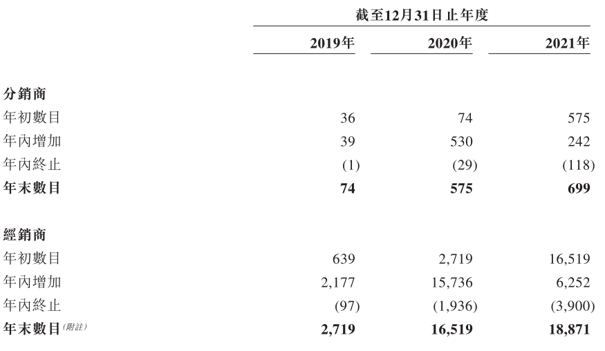 不过,由以上数据也可知,大约八成的经销商只拿了一次货。同时,招股书披露了分销商与经销商的数量变化。2020年是分销团队扩张最快的一年,而2021年不仅扩张速度下滑,分销商和经销商年内终止的数量分别为118名和3900名,几乎是新增数量的一半左右。可见分销商和经销商的生意,越来越不好做了。