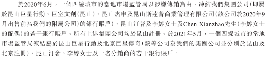 招股书披露,2020年6月,公司旗下昆山巨星行动、巨室文创(昆山)、昆山汀奢等公司,曾被某四线城市的当地市场监管局,以涉嫌传销为由冻结若干银行账户。去年5月,巨星传奇旗下多家公司再次被冻结若干银行账户。