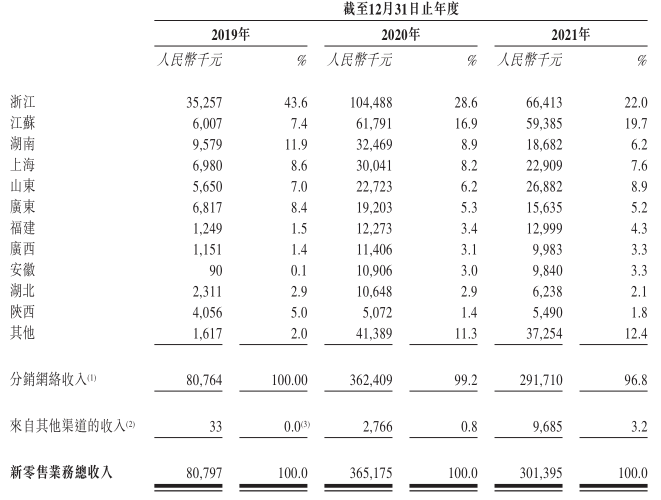 分销网络一直是巨星传奇新零售业务的主要销售渠道。招股书显示,在2019年~2021年分销网络贡献的营收分别为0.81亿元,3.62亿元和2.92亿元,分别占新零售业务的100%,99.2%和96.8%。