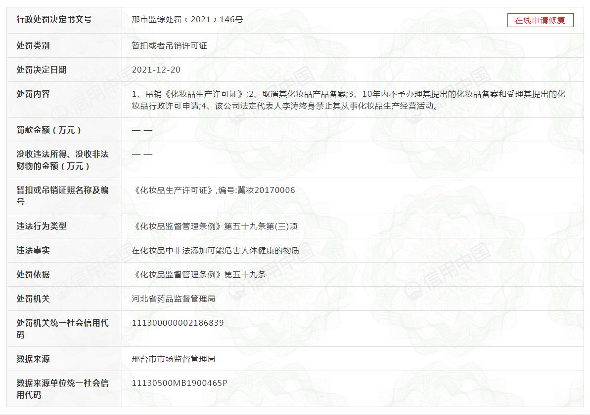 原来,早在2021年12月20日,河北省药监局就对康正药业进行了行政处罚,案由为“生产非法添加可能危害人体健康物质的化妆品”,处罚类型为“吊销许可证、资格罚”。