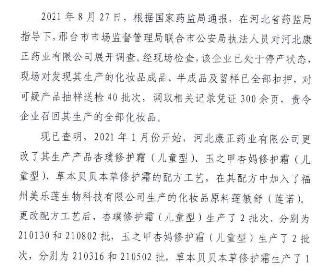 根据行政处罚书显示,2021年8月27日,在河北省药监局的指导下,邢台市市监局联合公安局执法人员对康正药业展开调查,经现场检查,该企业已处于停产状态。最终调查结果显示,2021年1月份开始,康正药业更改了其生产产品杏璞修护霜(儿童型)、玉之甲杏妈修护霜(儿童型)、草本贝贝本草修护霜的配方工艺,并且这3款产品的共计5个批次产品中,均检出了本维莫德(苯烯莫德)成分,原因是这些产品在生产过程中,加入了福州美乐莲生物科技有限公司(下称福州美乐莲)生产的化妆品原料莲敏舒(莲诺)。