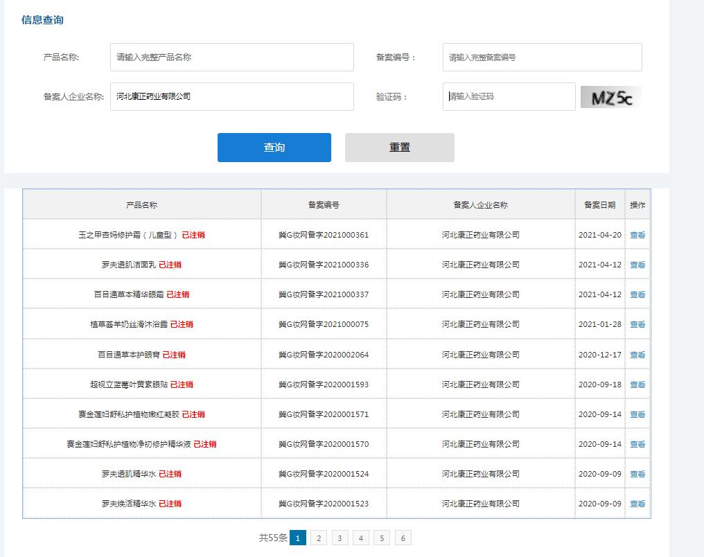 国家药监局普通化妆品备案平台信息显示,目前,康正药业旗下备案的普通化妆品均已取消备案,其中就包含了上述涉案的三款产品。
