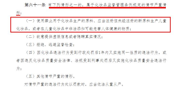 其中所依据的《化妆品生产经营监督管理办法》与《国家药监局综合司关于开展儿童化妆品专项检查的通知》中,均含有“在儿童化妆品中非法添加可能危害人体健康的物质,属于情节严重情形”的明确指示。