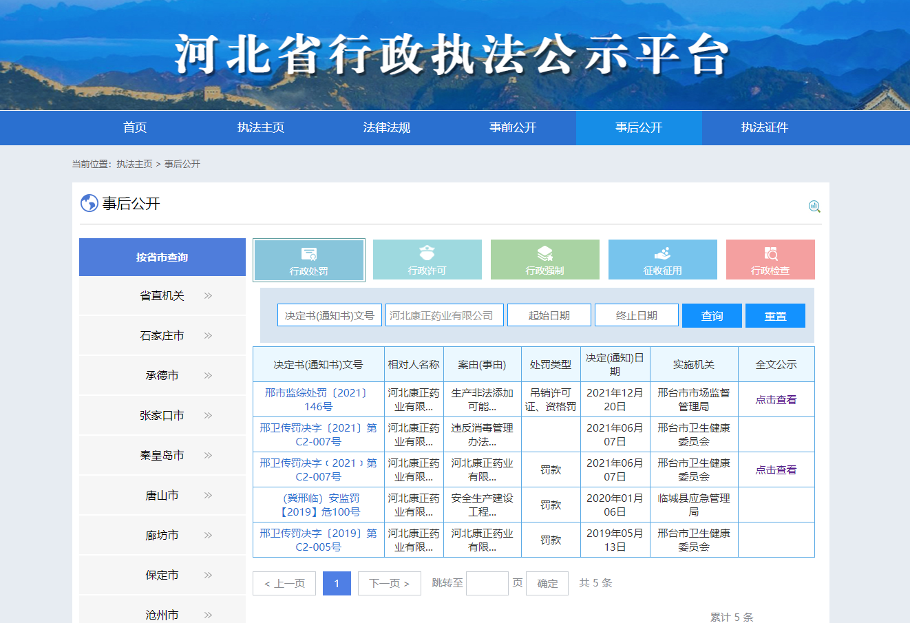 值得一提的是,康正药业在近3年内已多次被罚。根据河北省行政执法公示平台信息显示,该企业曾在2021年6月7日因违反消毒管理办法而被邢台市卫建委罚款3000元;2020年1月6日,该公司因安全生产建设工程项目违法,被邢台市临城县应急管理局处罚;2019年5月13日,该公司因消毒产品标签不符合要求等,被邢台市卫健委处罚。