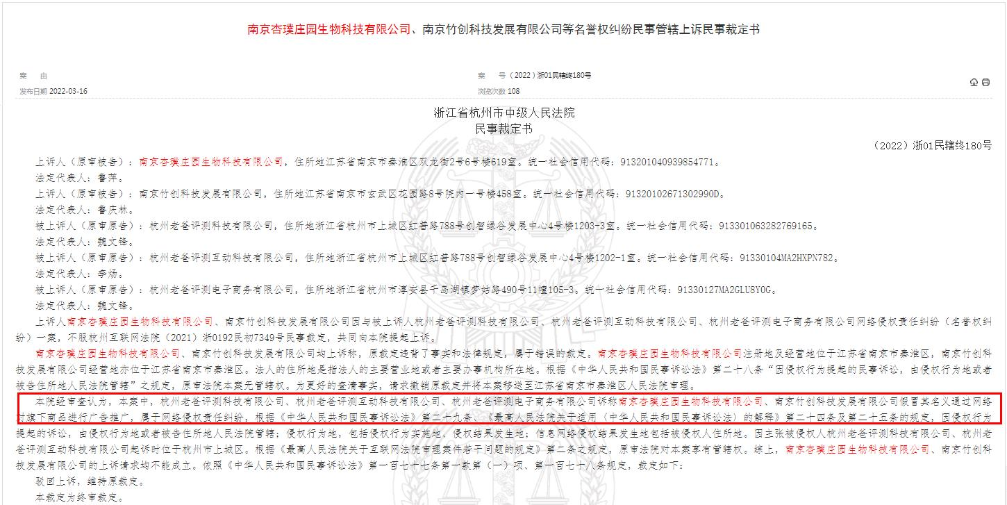 不过,“被代言”的老爸评测最终将南京杏璞庄园生物科技有限公司(下称杏璞庄园)告上了法庭,诉称对方侵权。杏璞庄园正是杏璞修护霜的主体公司。